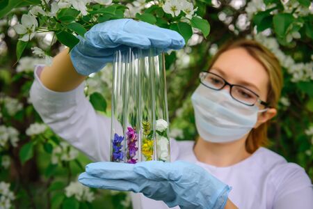 Female scientist wearing glasses, mask and gloves with test tubes in her hands studies the properties of plants against flowering tree. Creation of natural cosmetics, herbal medicine, perfumes.