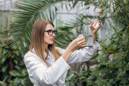 Botany, agronomy, work in greenhouse. Young high skilled professional female scientist biologist, dressed in lab coat, working in hothouse, pouring clear liquid from flask into set of test tubes.
