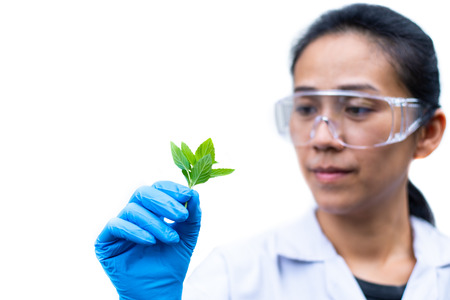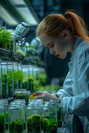 Young female scientist in lab coat and glasses working with plants in test tubes