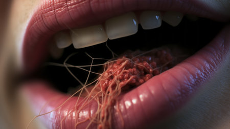 a closeup of a woman's mouth, showcasing intricate details and hyperrealism. the image captures a stray piece of hair, adding a touch of imperfection. the style of vray tracing and conceptual embroideries enhances the visual impact. shot with a goerz hypergon 65mm f8 lens, the light navy and pink tones create a captivating contrast. this national geographic photo is a stunning example of photorealism. ai
