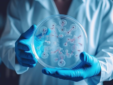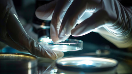 Close-up of a scientist in lab coat and gloves examining a petri dish with bacterial cultures