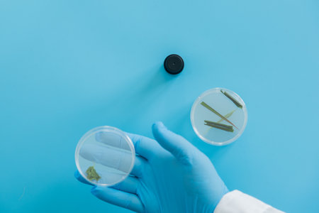 scientist holding a petri dish with plant on blue background