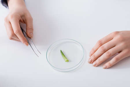 top view of laboratory assistant holding tweezers near test plate with aloe sample