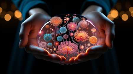 ball with microbes in human hands.