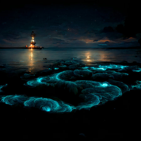 Glowing marine organisms float in the calm ocean, reflecting moonlight in a serene night atmosphere.