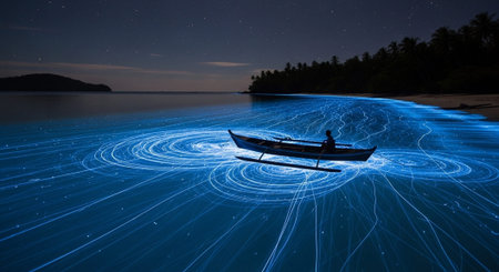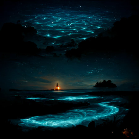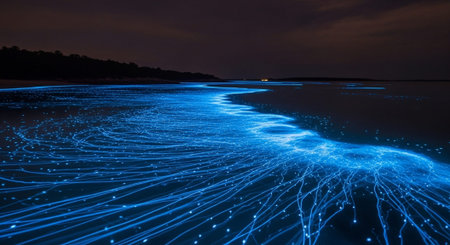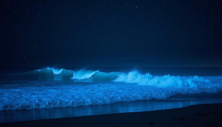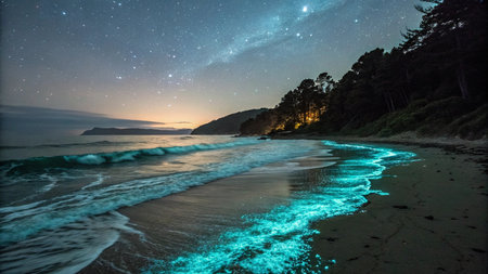 Bioluminescent waves light up the shoreline, creating a mesmerizing blue glow in the water under the night sky. The scene captures the beauty of nature in a coastal environment.
