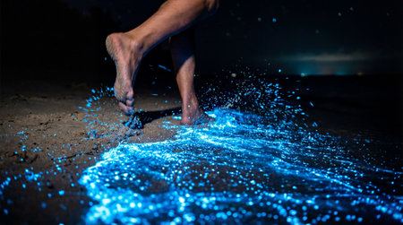 Bare feet of a person stepping onto wet sand at night cause a splash of bright blue bioluminescent plankton, illuminating the immediate area against the dark background.
