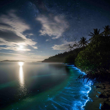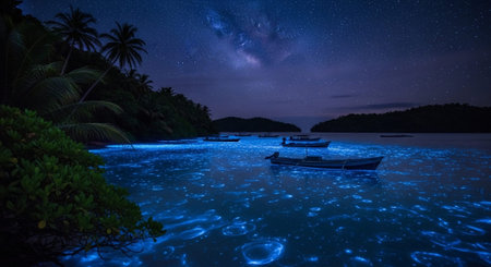 Bioluminescent bay at night with a starry sky and the Milky Way