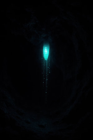 Bioluminescent cocoon hanging in a dark cave with glowing strands. Mysterious atmosphere.