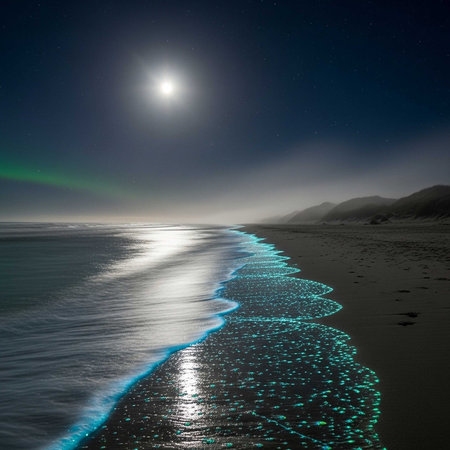 Glowing blue waves meet dark beach under full moon