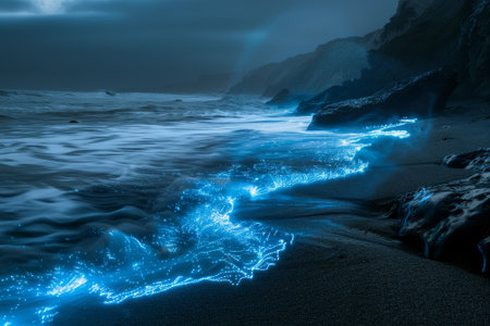 Bioluminescent waves on a dark beach at dusk