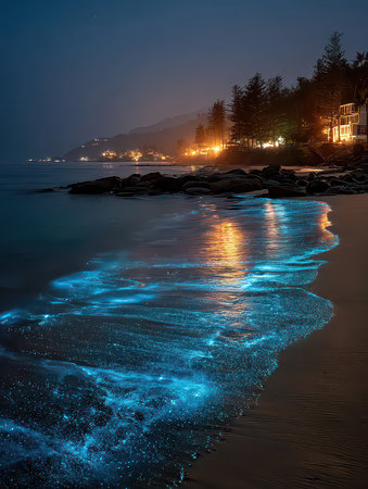 Stunning view of bioluminescent waves gently lapping a tranquil beach at dusk, highlighted by distant city lights. A mesmerizing natural phenomenon.