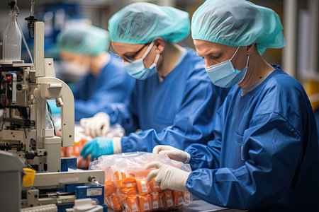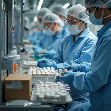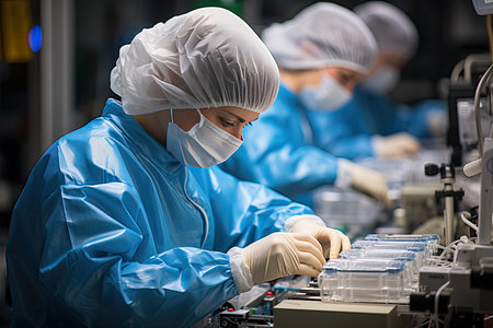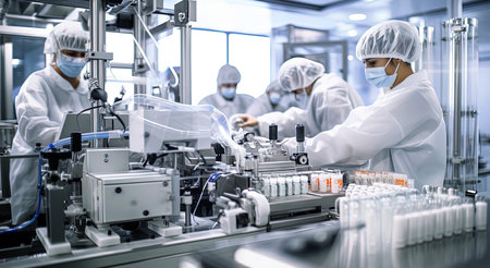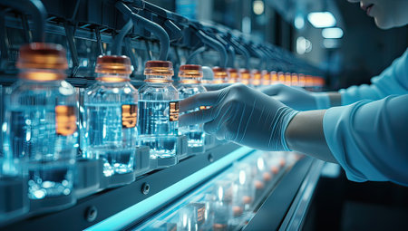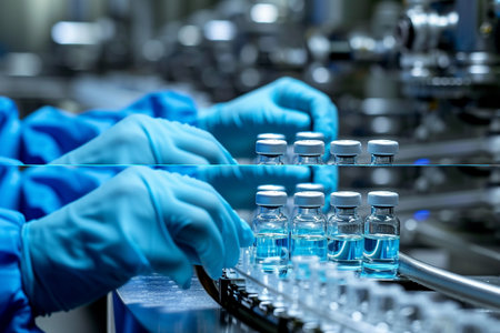 painstaking process of pharmaceutical manufacturing with a striking image of a gloved hand carefully inspecting medical vials on the assembly line of a modern pharmaceutical factory.?