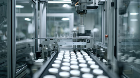 A modern automated production line showcases advanced robotics handling vials with efficiency in a sterile environment, emphasizing technology in pharmaceutical manufacturing.