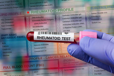 Blood sample tube for analysis of Rheumatoid profile test in laboratory. Blood tube test with requisition form for Rheumatoid test