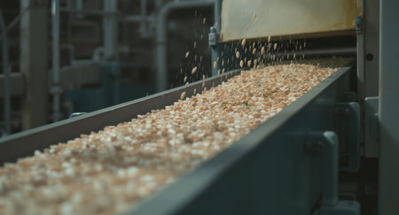 Cereal grains moving along an automated industrial conveyor belt in a modern food processing plant, highlighting efficiency and large scale production.