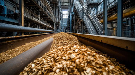 This image captures a detailed close-up of wood chips on a conveyor belt within a modern industrial facility, emphasizing sustainable production practices.