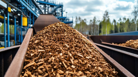 Wood chips transported on a conveyor belt, providing a sustainable fuel source for biomass power plants
