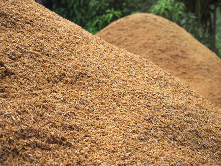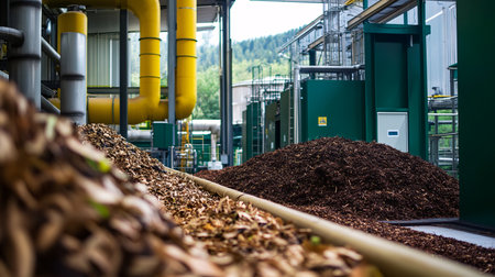 AI Generated. Close-up of biodegradable waste at a biomass facility, focusing on eco-friendly practices in converting waste to energy,