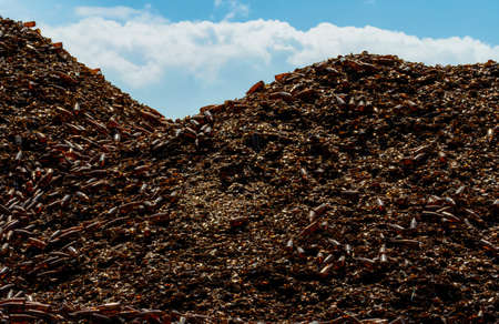 Pile of brown bottle for recycle in recycling factory. Glass waste for recycle. Dump of brown beer and wine glass bottle. Smashed glass bottle garbage. Recycling business. Sustainable glass packaging.