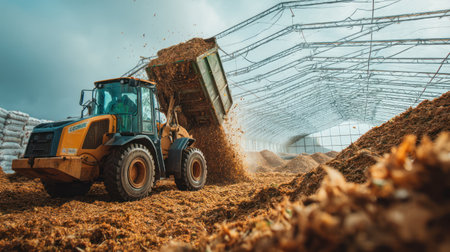 Composting facility processing organic waste with loader dumping material inside large covered structure, promoting sustainable production