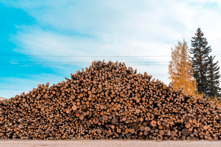 Big pile of large cut down logs stacked at the transportation site. Timber wood industry, deforestation, natural resources, construction material, firewood.