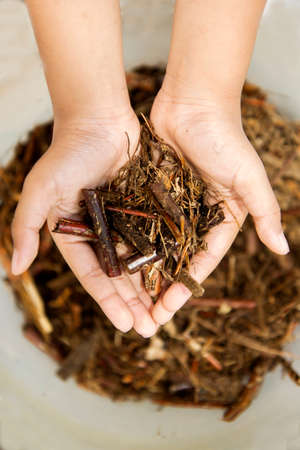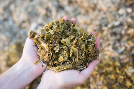 A woman in blue rubber gloves holds brown and yellow wood filings. Remains of wood shavings after sawing wood in the garden.