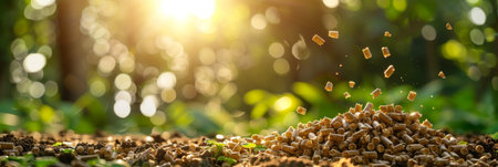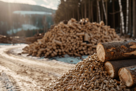 AI Generated. Wood pellet production impact deforestation visible in forest scene featuring pile of pellets
