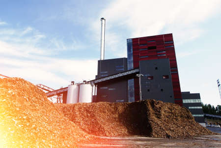bio power plant with storage of wooden fuel (biomass) against blue sky