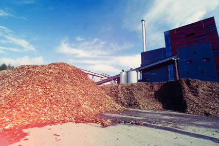 Large piles of light and dark wood chips sit in front of an industrial plant under a partly cloudy sky. The image has a slightly gritty and industrial feel.