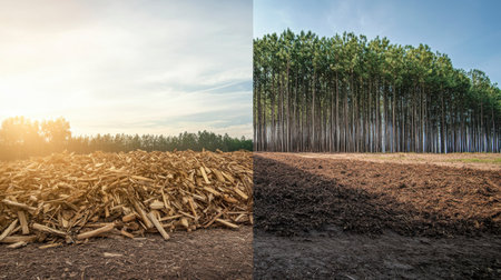 Split image showing deforestation and reforestation. Left side depicts a pile of cut wood, right shows replanted pine trees. Warm lighting contrasts the barren and lush landscapes. Depicts environmental themes of sustainability and renewal.