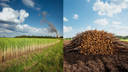 A split image depicting contrasting scenes a field of crops near an industrial smokestack, and a large pile of chopped wood. The imagery suggests themes of environmental impact and resource consumption.