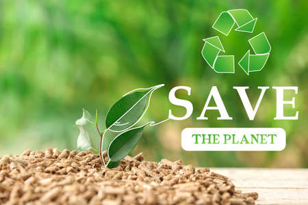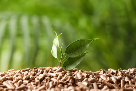 Pile of wood pellets and green plant on table, closeup. Save the planet