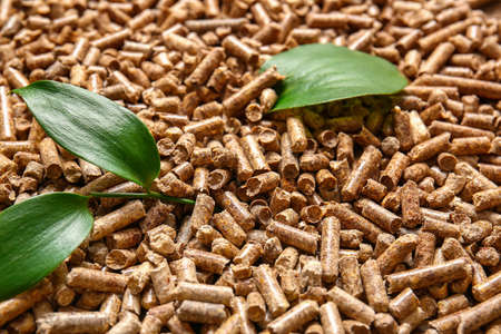 Wood pellets and leaves as background, closeup