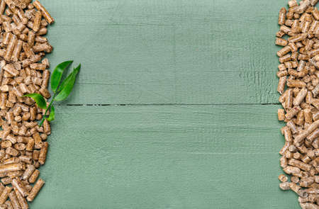 Wood pellets on green wooden background