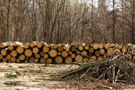 Pile of logged tree trunks. Sawn trees from the forest. Logging timber wood industry.