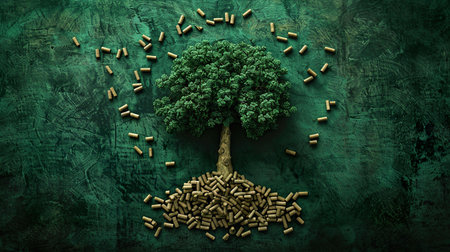 An artistic depiction of a tree formed from wood pellets on a textured green surface.