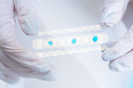 chemist wearing gloves at laboratory. testing process with glass plate and sample. viruses and health care concept