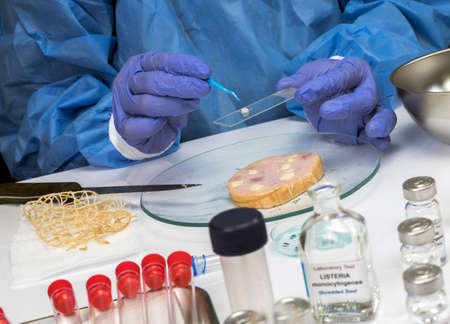 Expert analyzes stuffed meat contaminated by bacterium of listeria in laboratory, sprout caused in Spain