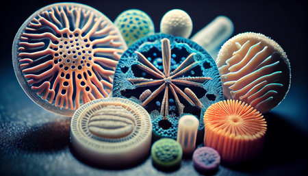 Microscopic view shows vibrant microorganisms with fascinating details and textures.