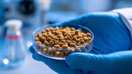A researcher scrubs textured powders in a dish, donning protective gloves amidst a lab filled with glassware and scientific tools.
