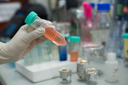 Hand in medical glove gets small test tube