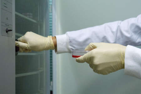 Close up of a doctor wearing blue gloves holding a syringe with his hands, taking a sample of red liquid from a round plastic container with a group of round red clinical sample in the background