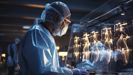 A focused scientist in a white lab coat diligently operates a computer in a high-tech laboratory.