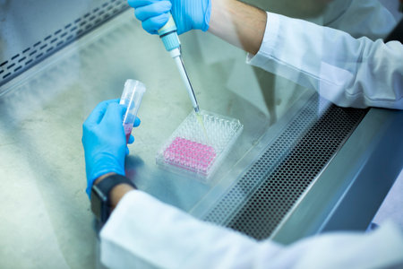 Cancer research laboratory, hands of scientist preparing cells using electronic pipette