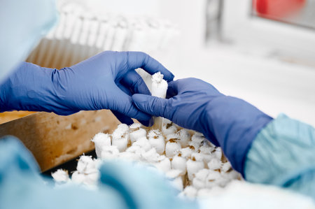 A close-up image of a laboratory worker in blue gloves carefully handling a rack of test tubes with purple caps, emphasizing precision and professionalism in scientific research.