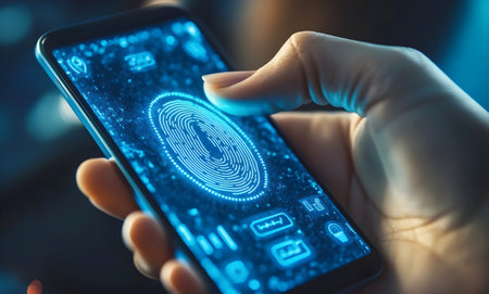 Futuristic smartphone with biometric fingerprint scanning technology, glowing digital security interface