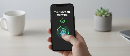 Persons hand holding a smartphone showing a transaction verified message and a biometric fingerprint scanner, illustrating secure online payment and mobile banking