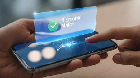 152722 showing biometric signature verification on smartphone screen with holographic...