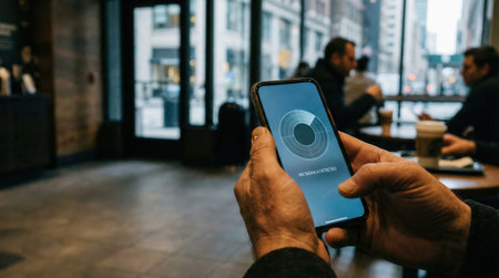 A vpn privacy safety smartphone secure browsing hand holding mobile phone in cafe for online protection and calm digital life